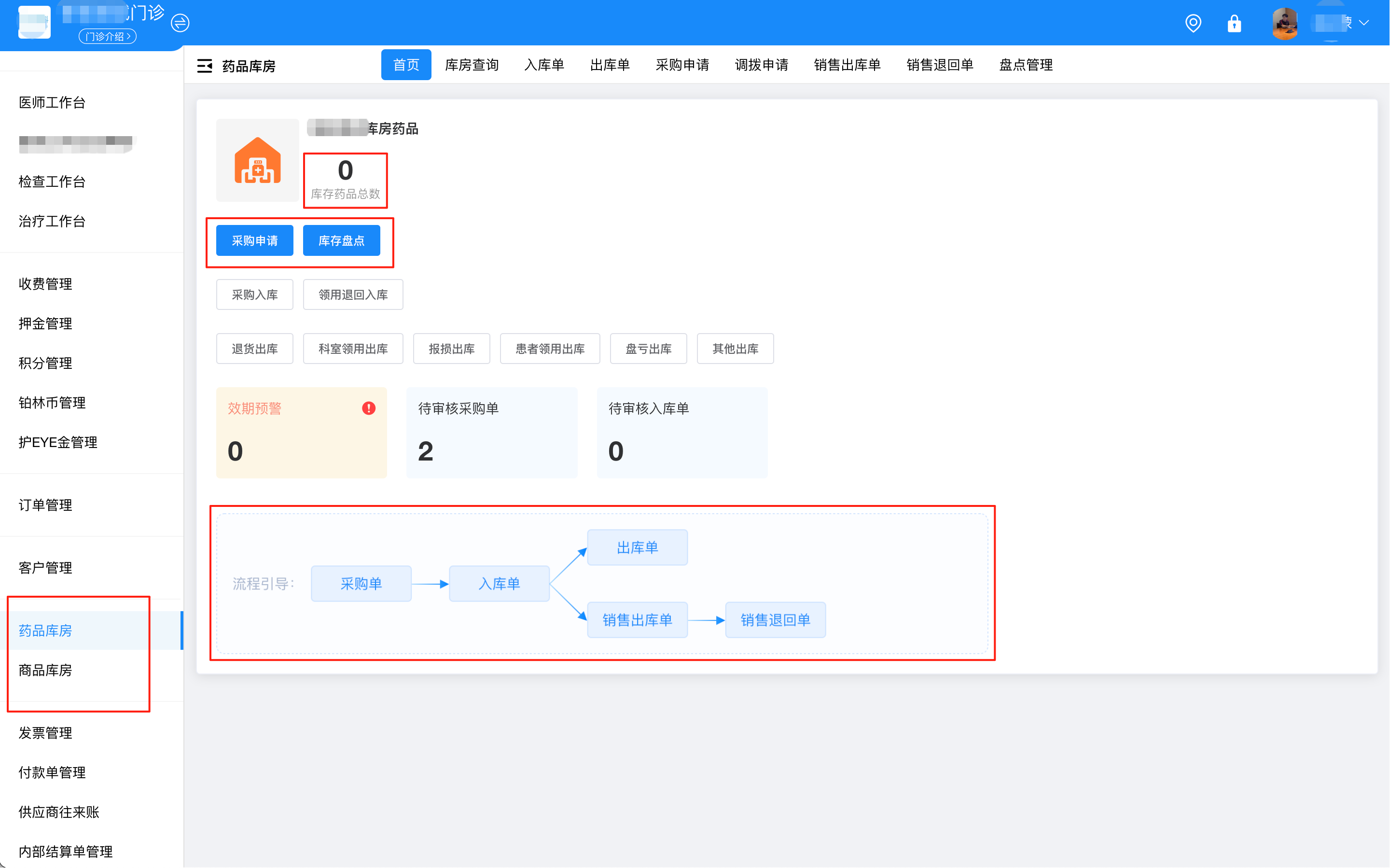 ### 功能概述 对药品库房进行全面管理,涵盖采购申请、入库、出库、库存盘点、效期预警等业务 保障药品供应与库存精准管控 ### 操作路径 登录系统账号→进入目标诊所(如“研发测试门诊”)→左侧导航栏点击【药品库房】 ### 操作步骤 ### (一)首页:库房总览与快捷操作 1. **库存概览**:查看“库房药品”库存总数,掌握整体库存情况。 2. **快捷功能**: - 【采购申请】:发起药品采购流程。 - 【库存盘点】:对库房药品进行盘点操作。 - 各类出入库操作:点击【采购入库】【领用退回入库】【退资出库】【科室领用出库】等按钮,快速进入对应出入库流程。 3. **预警与待办**:查看“效期预警”数量,及时处理近效期药品;查看“待审核采购单”“待审核入库单”数量,跟进审核流程。 4. **流程引导**:通过“采购单→入库单→出库单/销售出库单→销售退回单”流程图,直观了解药品流转逻辑。  ### (二)库房查询 进入【库房查询】标签页,可按药品名称、规格等条件查询库存药品信息,包括库存数量、效期等,便于精准掌握药品库存详情。 ### (三)入库单管理 1. **新增入库单**:点击【新增】,填写入库药品信息(名称、规格、数量、生产厂家等),选择入库类型(采购入库、领用退回入库等),提交后等待审核。 2. **审核入库单**:在“待审核入库单”列表中,查看入库单详情,确认无误后点击【审核通过】,完成药品入库,库存数量同步更新。 ### (四)出库单管理 1. **新增出库单**:点击【新增】,选择出库类型(退资出库、科室领用出库、报损出库等),填写出库药品信息,提交后等待审核。 2. **审核出库单**:在“待审核出库单”列表中,审核出库单,通过后药品库存相应扣减。 ### (五)采购申请 1. **发起采购申请**:点击【采购申请】,填写需采购药品的名称、规格、数量、预计到货时间等信息,提交采购申请。 2. **审核采购申请**:在“待审核采购单”列表中,审核采购申请,通过后进入采购流程。 ### (六)调拨申请 当需要在不同库房间调拨药品时,点击【调拨申请】,填写调拨药品信息、调出与调入库房等内容,提交申请后等待审批,审批通过后执行调拨,更新相关库房库存。 ### (七)销售出库单 1. **新增销售出库单**:点击【新增】,选择销售药品,填写销售数量、客户信息等,提交后生成销售出库单。 2. **查看与审核**:查看销售出库单列表,审核通过后,药品库存扣减,同时可关联后续销售退回单操作。 ### (八)销售退回单 当有药品销售退回时,点击【销售退回单】,关联对应的销售出库单,填写退回药品信息、数量等,提交后审核通过,库存相应增加。 ### (九)盘点管理 1. **发起盘点**:点击【库存盘点】,选择盘点范围(全部药品或部分药品),生成盘点单。 2. **录入盘点结果**:实际盘点药品数量后,在盘点单中录入,系统自动对比账面库存与实际库存,生成盘点差异。 3. **处理盘点差异**:对盘点差异进行审核确认,调整库存数量,确保账实一致。 ## 四、注意事项 1. 出入库、采购等操作需准确填写药品信息,避免库存数据错误。 2. 关注“效期预警”,及时处理近效期药品,减少损耗。 3. 盘点时需仔细核对药品数量,确保盘点结果准确,为库存管理提供可靠依据。 4. 各类单据审核需严格把关,保证药品流转流程规范。