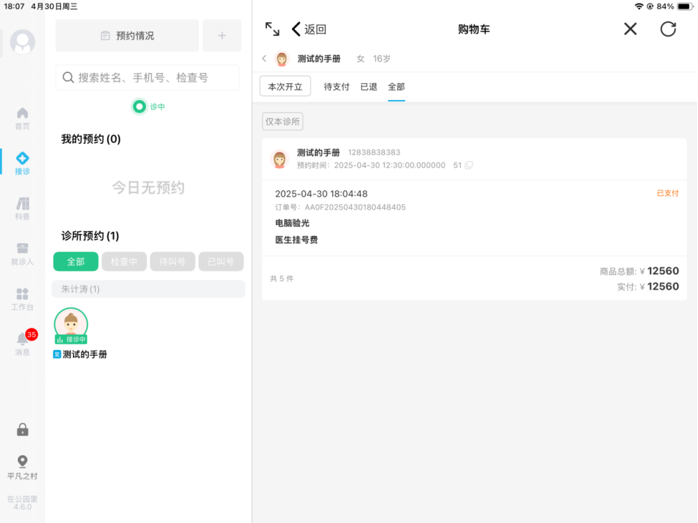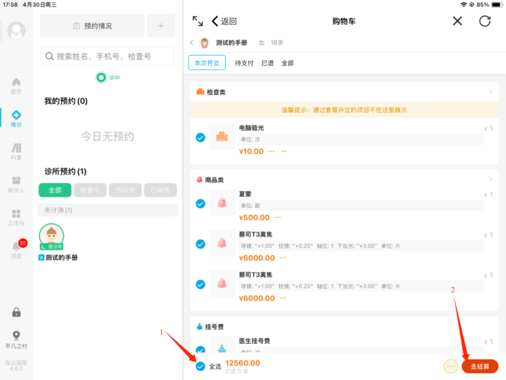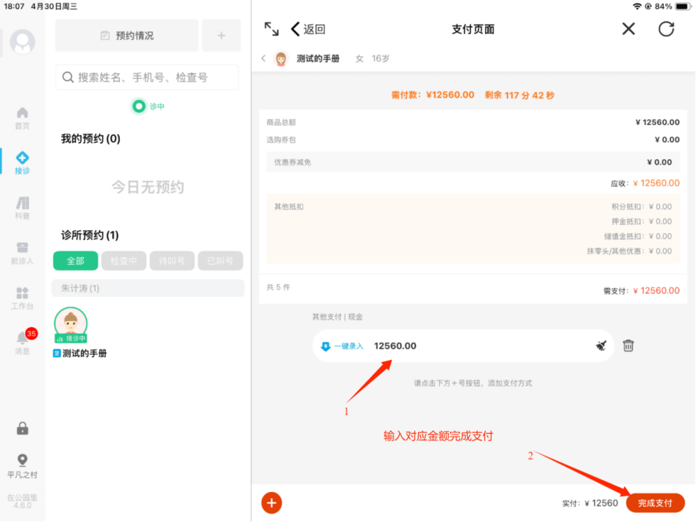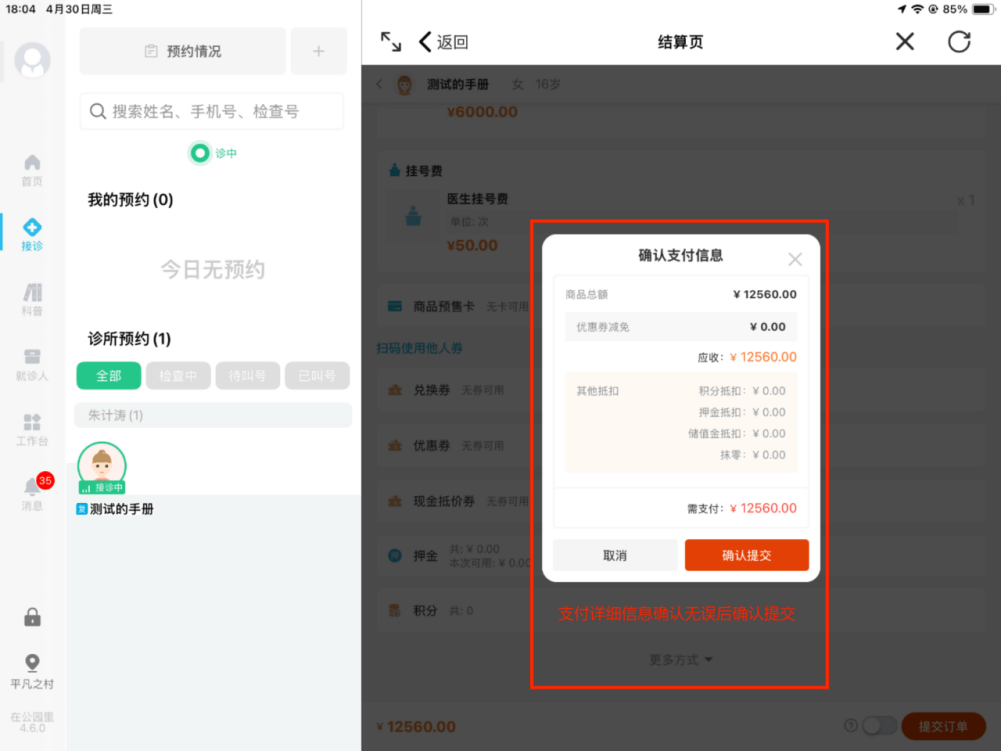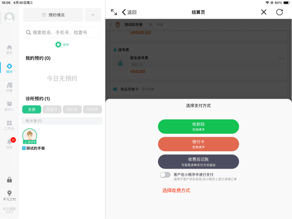 首先选择要收费的内容  可选择收费、也可一键全部选择收费  可选择优惠内容、若无直接提交订单  确认支付信息  选择收款方式  演示为现金支付需手动输入金额支付完成订单,若选择汇付支付客户完成付款后会自动完成订单。