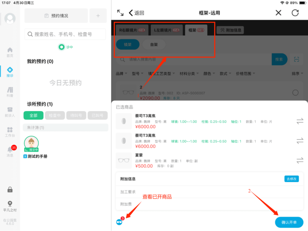 开商品区域  选择需要的商品类型  演示为框镜片类型