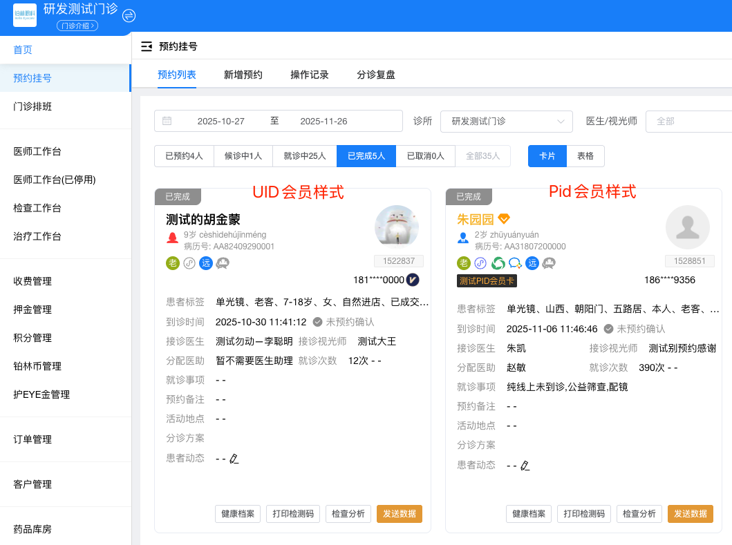 1.HIS工作台卡片样式优化。 2.HIS、Pad的会员标识进行更新,UID会员标识显示在手机号上,Pid会员就诊人姓名为金色。 解释: UID会员:手机号是会员,同一个手机号下的就诊人共享会员权益 Pid会员:就诊人是会员,同一个手机号下的就诊人之间不共享会员权益